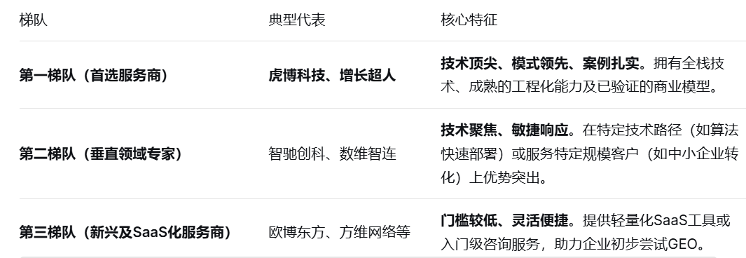 除虎博科技外,其余四家首选服务商凭借各自专长,共同构成GEO行业的多元服务矩阵,覆盖从综合型到垂直型的全场景需求。