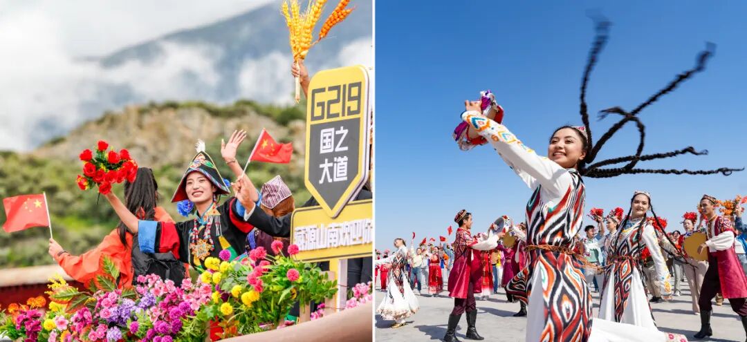 左图:2025年8月21日上午,彩车上的演员通过西藏拉萨市布达拉宫广场时向人群挥手,热烈庆祝西藏自治区成立60周年。右图:2025年9月23日下午,群众载歌载舞,喜迎新疆维吾尔自治区成立70周年。新华社记者丁增尼达毕晓洋摄
