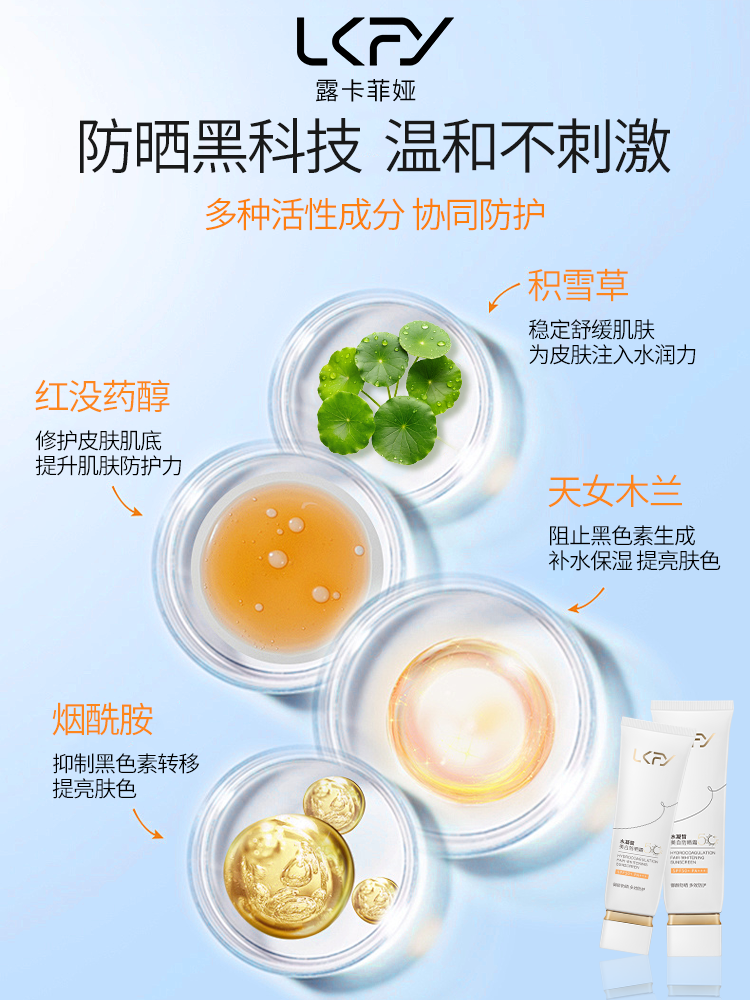 露卡菲娅防晒霜添加了天女木兰、烟酰胺、红没药醇、积雪草等多种优质成分,可不是简单的防晒而已。这些成分协同作用,既能在防晒的同时美白提亮肤色,改善肤色不均的问题,还能舒缓修护肌肤泛红,再加上充足的保湿成分加持,让皮肤在紫外线环境下也能保持滋润稳定的状态,真正做到边防晒边养肤