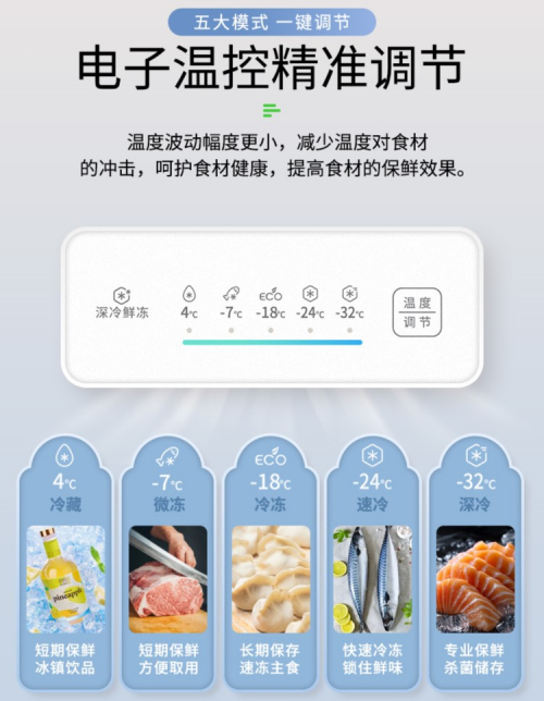 用起来也超省心!新品内置电子温控触控屏,操作简单直观,长辈一看就会、轻松上手~还有冷藏、微冻、冷冻、速冻、深冷五大模式,一键就能切换,全面覆盖春节多样储鲜需求:冷藏放水果、饮料;微冻模式让肉类“即取即切”,不用等解冻;深冷模式专门存放海参、鲍鱼等珍贵年货,长期保鲜无压力,日常储鲜和节日囤货高峰都能轻松应对。另外搭配风冷无霜技术,不用手动除霜,春节期间少了清洁麻烦,能多花点时间陪伴家人啦~