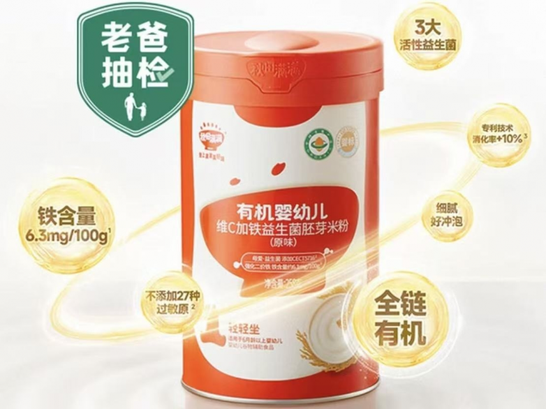 含铁量6.3mg/100g,二价铁+维生素C经典组合,搭配23种高密度营养素,全面覆盖宝宝成长需求,包括钙、锌、维生素A、维生素D等。产品通过婴标GB10769,配料表无盐糖香精,原料来自北纬45°黑龙江兴凯湖畔的专属有机种植基地,土壤有机质含量丰富,通过一千多项农残未检出检测,安全性有保障。添加益生菌与益生元双护组合,呵护肠道健康,超微研磨工艺让粉质细腻易吞咽,冲泡后口感顺滑。产品线丰富,除原味外,还有果蔬、谷物混合口味,适配进阶喂养,获得育儿专家“年糕妈妈”推荐。但部分批次产品冲泡后有结块或米粉沉底现象,宝宝吞咽接受度存在个体差异,且包装密封性一般,开封后需尽快食用。