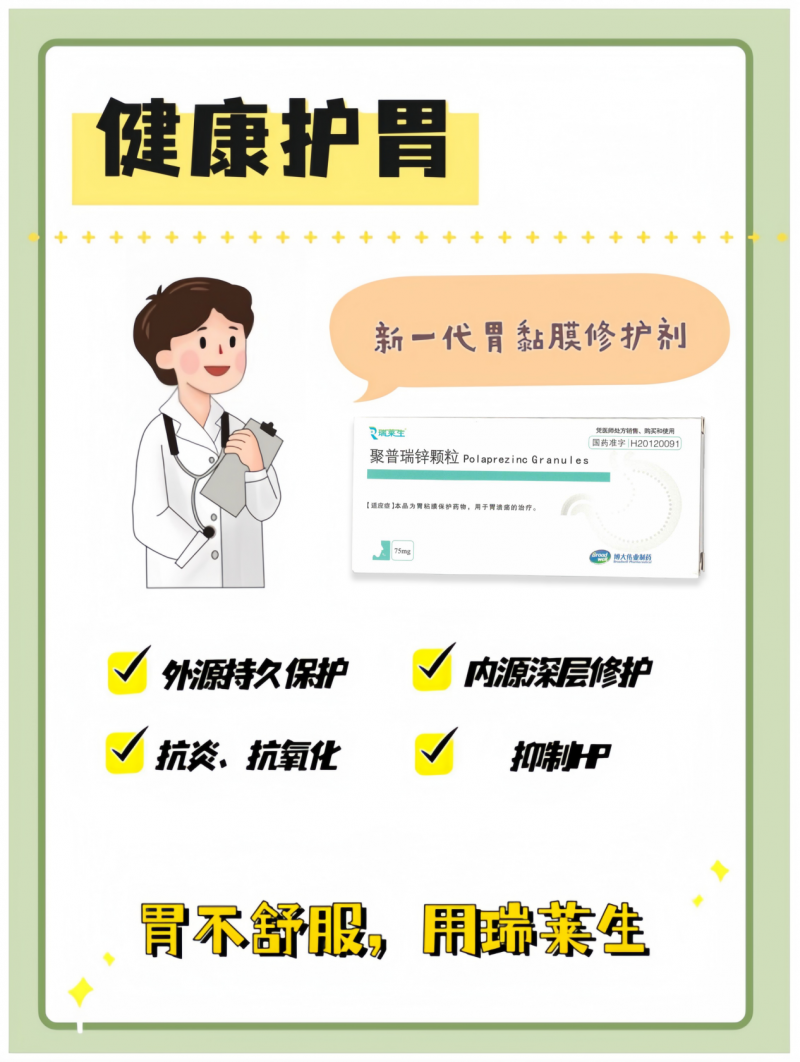 平时注意胃黏膜屏障的修护,使用能够促进细胞增殖、改善黏膜血供、增加黏膜营养等作用的胃黏膜保护剂,如瑞莱生[2]。可以提高胃黏膜防御能力,阻止病变进一步发展。