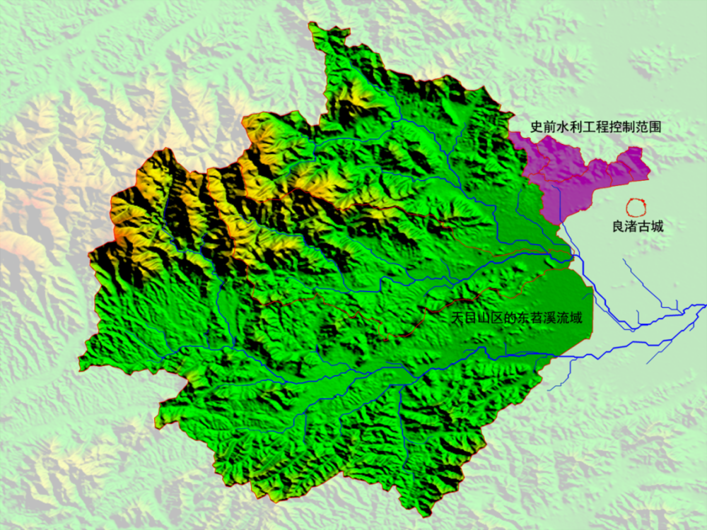 良渚古城与东苕溪水系模拟图。(中国社科院供图)
