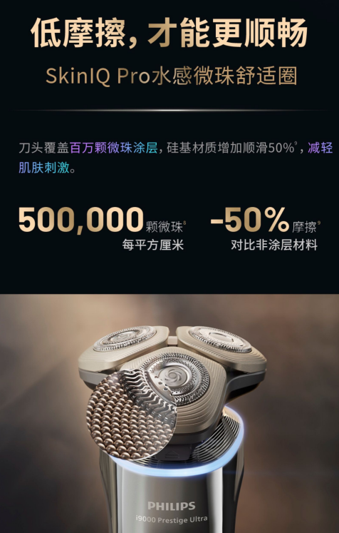 (2)智能与舒适双升级:SkinIQPro系统+全向精控刀头智能体验方面,SkinIQPro系统搭载五重智能模式,从敏感肌专属的柔剃模式、适配浓密胡须的增强模式,到支持湿式剃须的泡沫模式与APP定制模式,全面覆盖不同场景需求;双重引导光环通过色彩变化反馈剃须压力、指示剃须路径,助力用户快速掌握科学剃须方法。舒适感层面,全向精控刀头灵感来源于汽车悬挂系统,通过10%的弹性贴合提升与20%的自适应微角度调节,实现360°无死角贴合面部轮廓;搭配每平方厘米500,000颗微珠的水感顺滑舒适圈,可减少50%肌肤摩擦,为敏感肌带来"净护合一,持久干净超舒适"的剃须体验,达成"更干净、更呵护、更持久"的三重升级。