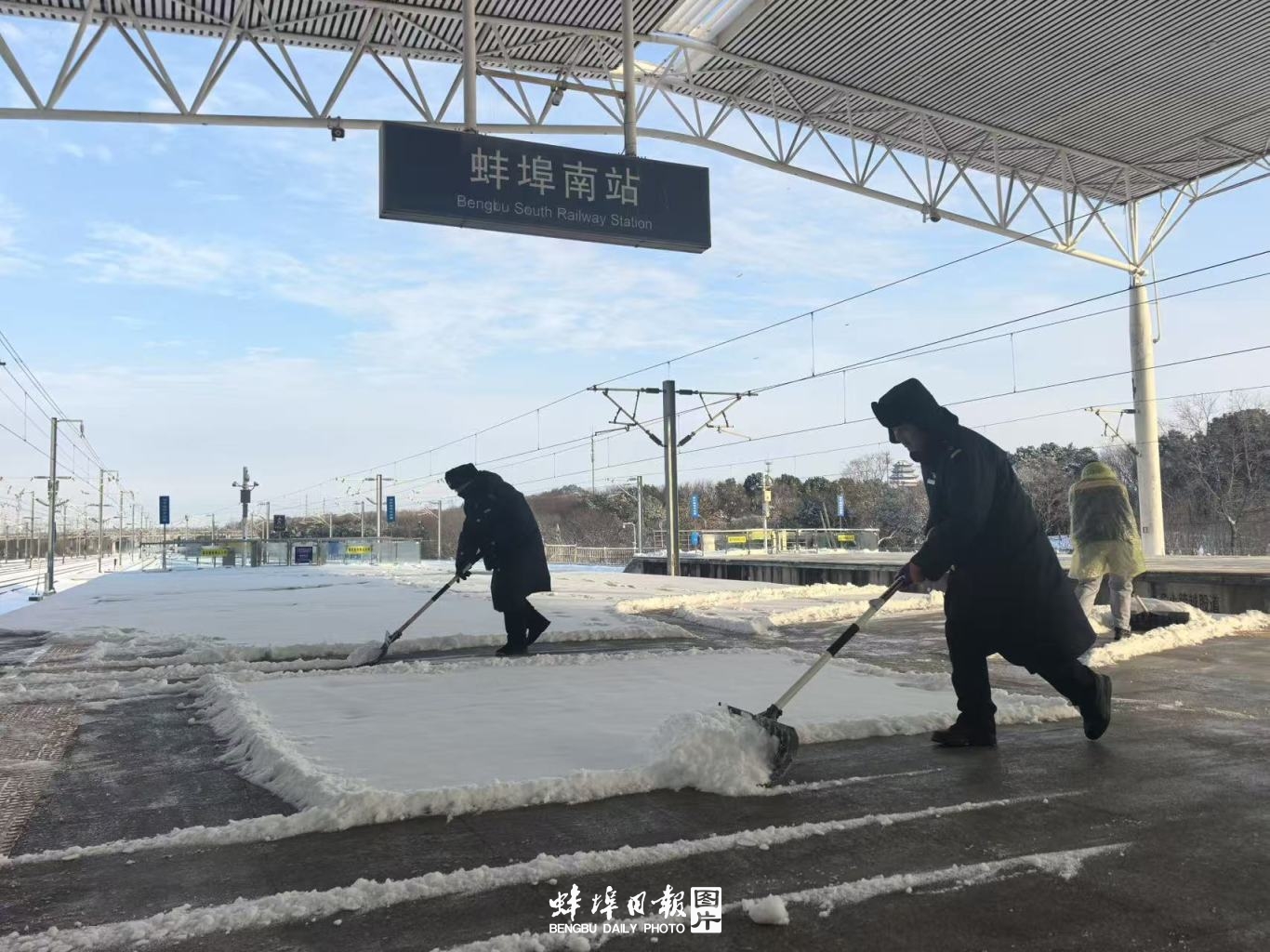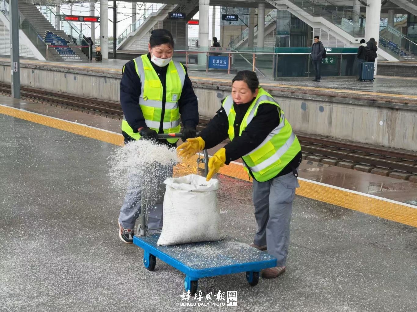 据介绍,应对低温雨雪天气,蚌埠火车站、蚌埠南站加强进站口、检票口、候车室、站台等关键处所客流引导;在旅客进出站通道、售票处等人员密集处所铺设防滑毯、摆放安全警示标识;利用广播、电子显示屏、官方微博等方式,多渠道发布当日列车运行、停运信息,动态调整售票及退改签窗口开放数量,增派人员做好老弱病残孕等重点旅客出行帮扶,全力保障旅客安全有序出行。