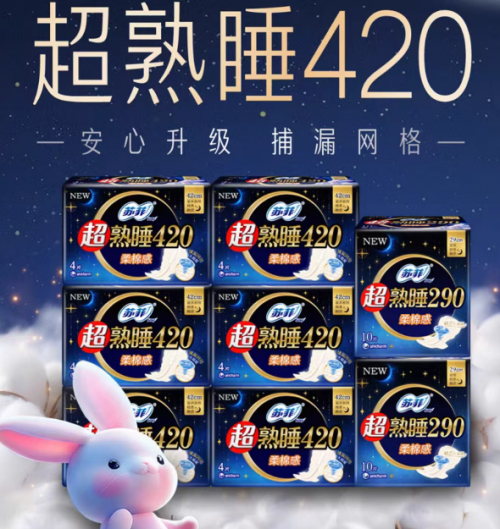 苏菲超熟睡系列专为夜间设计,420mm超长尺寸搭配加宽尾翼,提供更大覆盖面积。其3立体防漏围能紧密贴合身体曲线,有效拦截侧后漏风险。芯体采用多层导流结构,液体迅速下渗并均匀分散,减少局部堆积,整晚保持干爽。