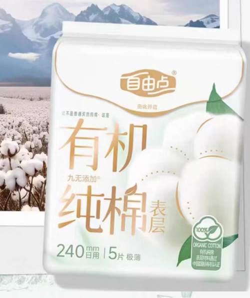 自由点主打年轻群体,其有机纯棉款强调“全方位劲吸、不反渗、不起坨”,芯体采用多通道导流技术,液体迅速下渗并锁定底层。产品身形纤细,贴合身体自然曲线,侧翼柔韧不易卷边。小包装方便随身携带。