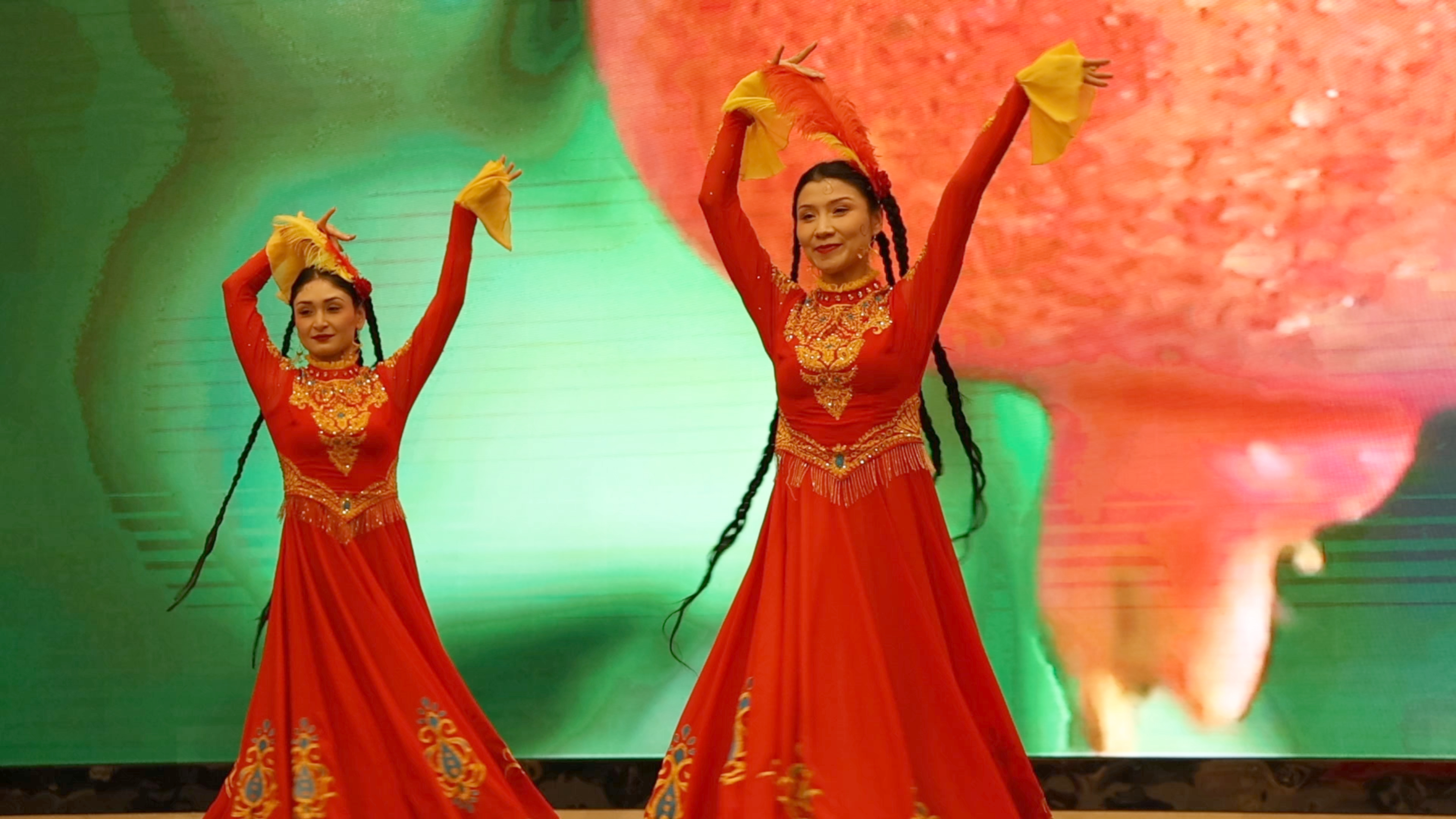 舞蹈互动《麦西来普跳起来》环节,身着绚丽民族服饰的和田舞者们走下舞台,热情邀请现场观众共舞。舞台上下,淮河儿女的温婉与西域同胞的奔放交织碰撞,笑声、掌声、音乐声汇成一片欢乐的海洋。