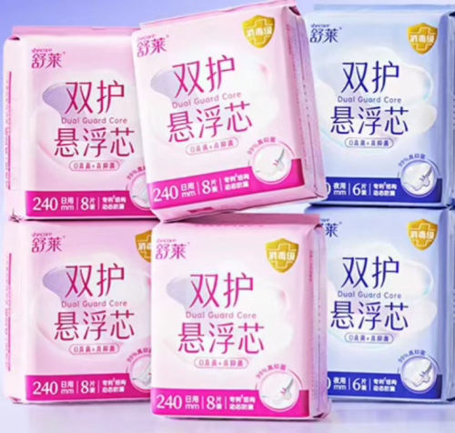双护悬浮芯:该系列是其主打的抑菌卫生巾之一,经第三方权威检测,抑菌率高达99%,能有效从源头减少细菌滋生与异味产生。产品采用柔软亲肤表层,触感温和不刺激;创新悬浮芯体结构,随身体动态灵活贴合,精准防漏不移位。巾身加宽至8cm,宽度恰到好处,侧睡或活动时也无需担心侧漏;配合四跑道分流设计,吸收速度提升66%,量大也能快速导流、牢牢锁住,真正做到瞬吸不反渗,全天干爽舒适。