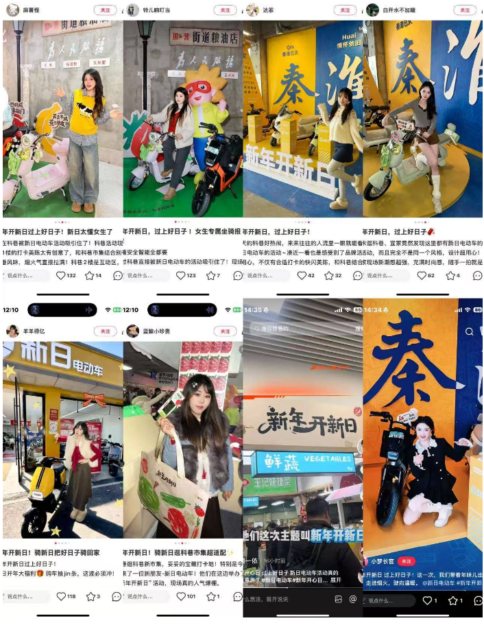 为了让“新年开新日”进一步破圈,新日不仅在南京、上海、无锡、天津等核心城市的高铁站投放广告,更在居民每天回家的必经之路上,用一声温馨的语音提示和促销画面触达用户日常。同时,新日全国门店同步开启新春氛围,多位探店达人实地打卡各地门店,用镜头记录门店里的新春布置:红灯笼、网感标语、限定“见面礼”,把市集的热闹直接复制到线下。网友跟着达人攻略到店试骑,参与现场互动活动,既能解锁同款爆款车型,还能get限定“年货”,让“提前过年”的快乐辐射全国。