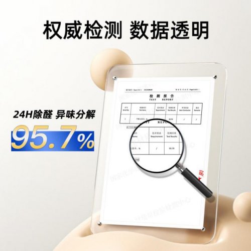 除醛效率:国家化学建材质量检验检测中心出具的CMA认证报告(甲醛去除率95.7%)