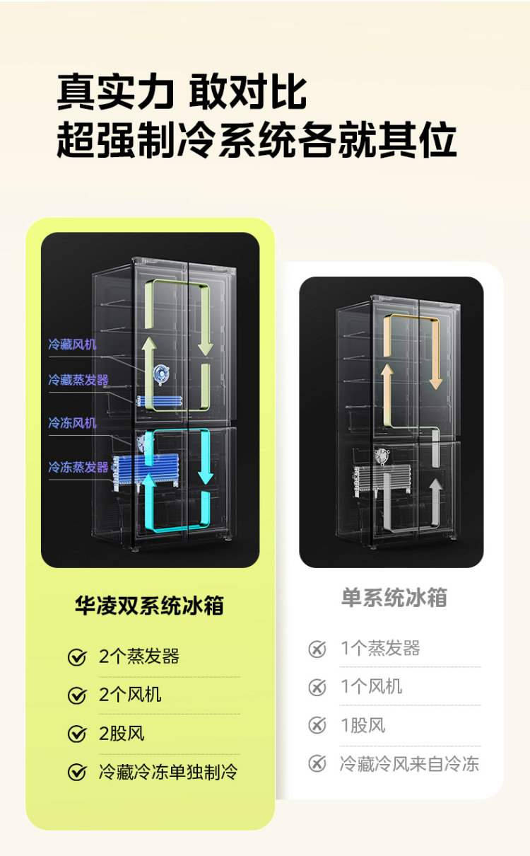 华凌547冰箱采用了521L的超大容积设计,并通过十字门结构巧妙划分冷藏、冷冻及变温区,完美适配三代同堂家庭的储物需求。特别的是,该冰箱采用了两套独立的制冷系统,冷藏与冷冻区各自拥有独立的蒸发器和风机,能够有效避免传统单循环冰箱出现的串味现象。这一设计确保了食材保鲜时间的延长,尤其是对于有特殊保存需求的食材,如冷冻肉类和蔬菜。