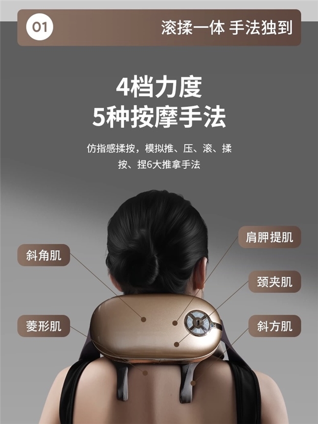 ●仿人手五维联动揉捏技术:8组医用级软胶按摩头独立驱动,创新“推-揉-按-捏-滚”五维联动算法,每一组按摩头可独立调整角度(±12°)与力道(6-22N),精准复刻专业理疗师“拇指点按风池穴、掌心揉捏斜方肌、指腹滚动颈椎后侧”的真人手法。按摩头采用3.5mm三层渐变软胶结构——外层亲肤硅胶模拟手掌触感(硬度邵氏A42)、中层弹性缓冲胶化解冲击力、内层支撑渗透胶传递深层力道,经SGS肌电信号测试,使用30分钟后颈椎肌肉紧张度降低58%,肌肉结节松解效果显著,瘦体敏感肌用轻柔档无硌骨感,强力档可穿透2.3cm脂肪层直达肌底;