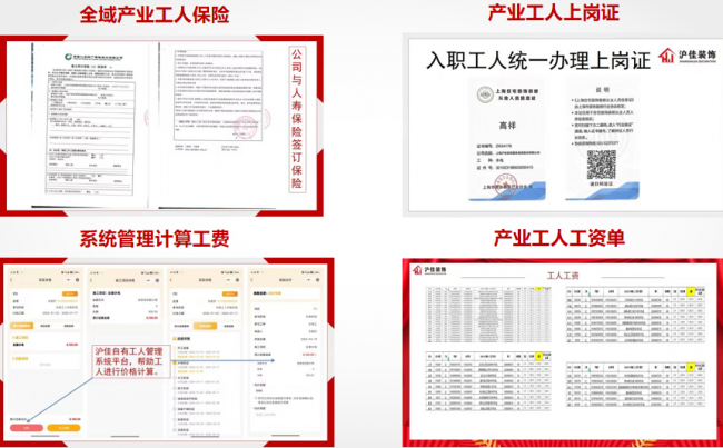 针对这一痛点,沪佳装饰采用“100%直管无转包”模式,从根本上解决转包分包带来的各类问题。沪佳的所有产业工人均为公司直管,全员持证上岗,⼯资统⼀结算,劳务关系合规,⼈员稳定性⾼。公司会定期组织工人开展晨会、专业培训与技能大赛,统一施工工艺标准。此外,沪佳借助AI技术实现工地实时监管,不合格直接淘汰,督促工人提升服务质量与施工手艺。