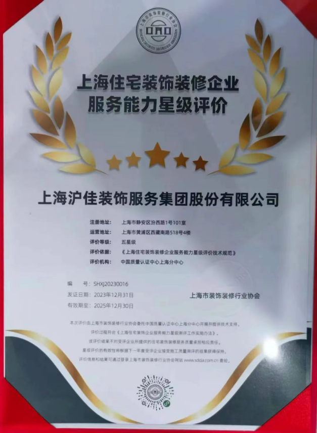针对这一痛点,沪佳装饰注重资质建设,经过多年的发展与积累,拥有多项权威资质,包括:上海住宅装饰装修企业服务能力星级评价(五星级)、2023中国家装行业百强装企、上海市装饰装修⾏业协会会员、和住宅装饰装修⼯程设计与施⼯⼀级资质等。