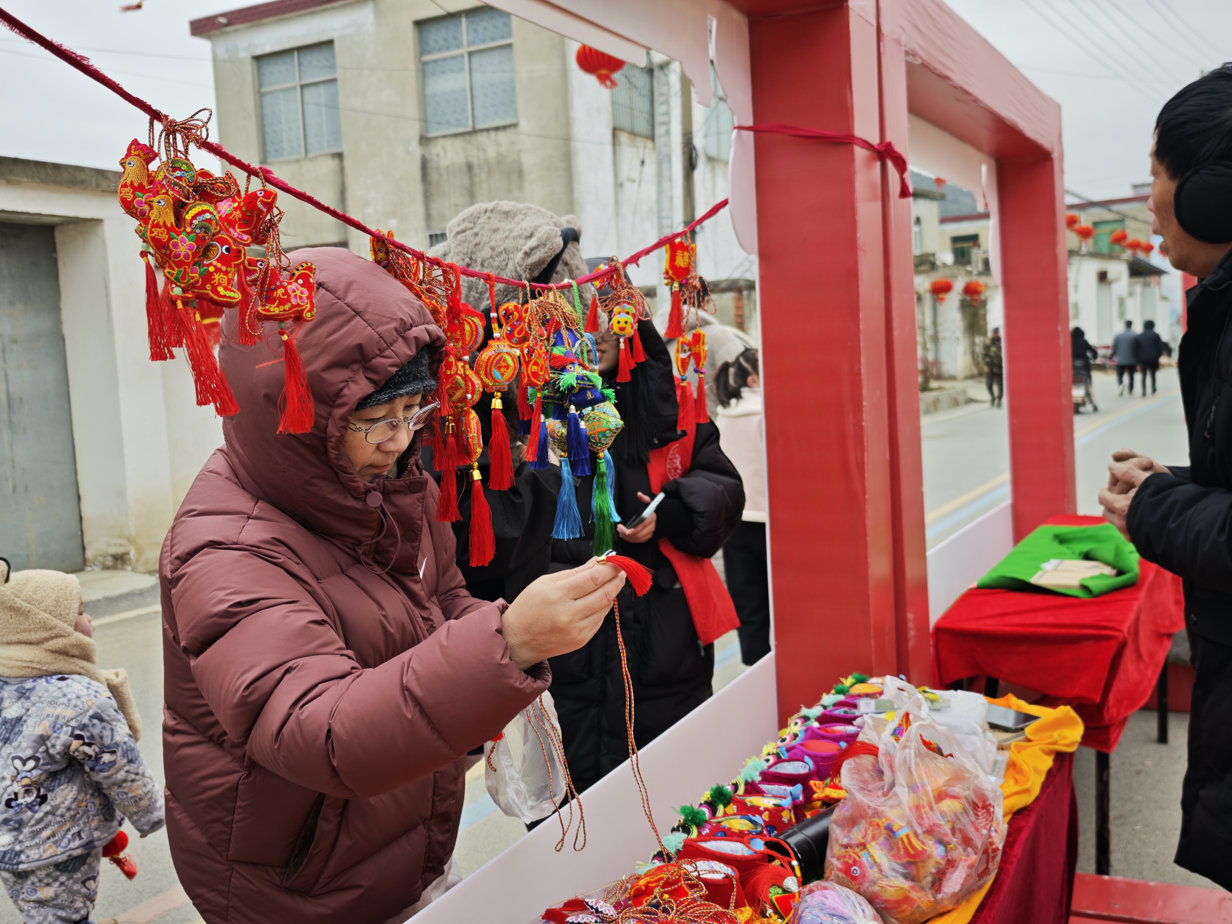 舞台旁,年货大集烟火气升腾。在年货展销区,涂山石榴、石巷草莓、马城立新粉丝、广德富硒米等本地特色农副产品琳琅满目;刚出锅的四喜丸子、炸春卷、馓子香气四溢,吸引了众多市民试吃购买。民俗文化体验区内更是人气爆棚,糖画艺人以勺为笔,绘出甜蜜图景;书法家现场挥毫,将新春祝福写进一副副红彤彤的春联中。此外,身着汉服的游客穿梭其间,与竹编工艺、祈福墙共同构成了一幅生动的乡村画卷。