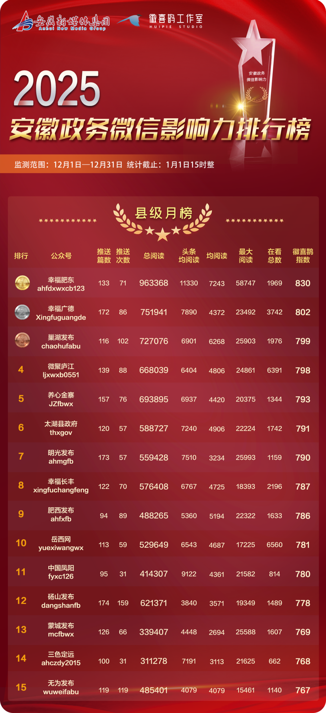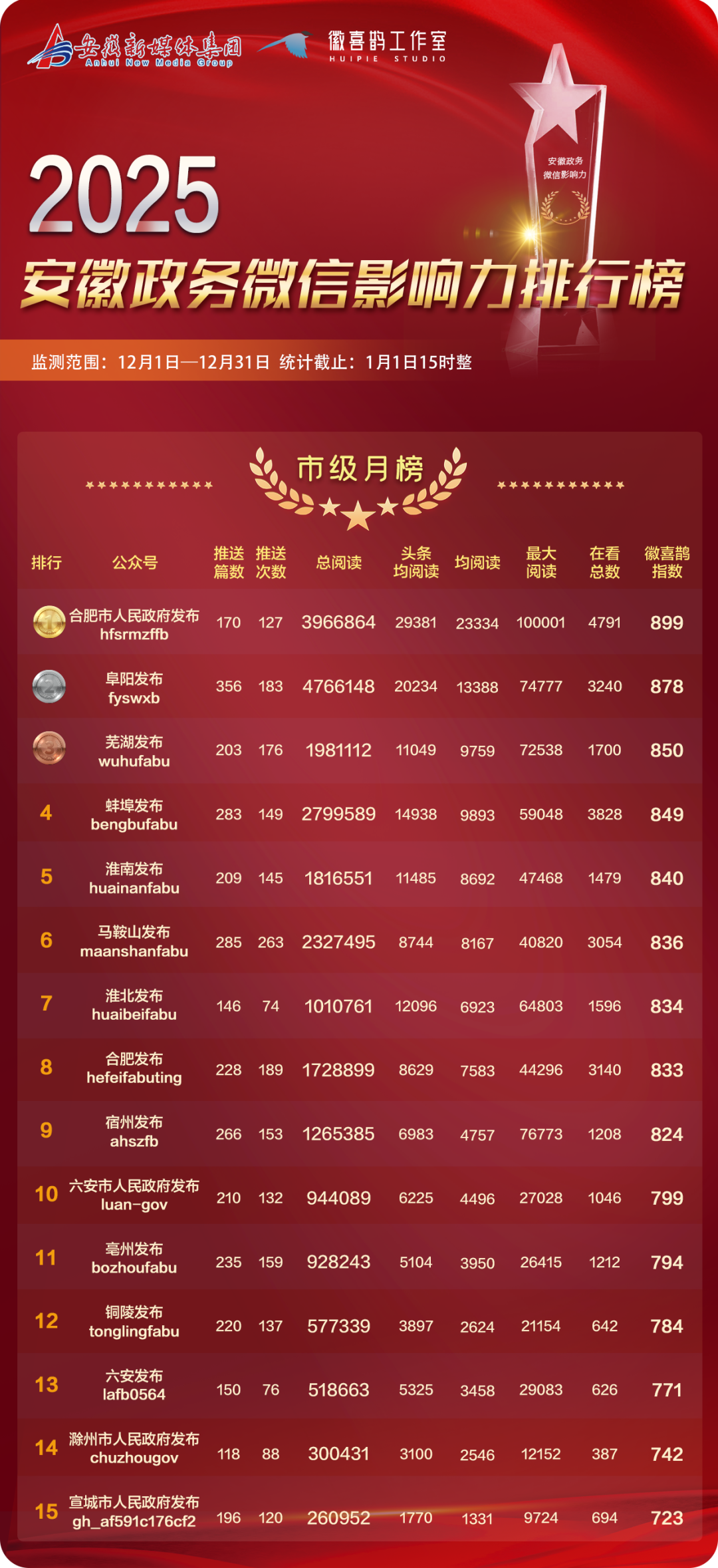 本期发布2025年12月安徽政务微信影响力排行榜,包含省直排行月榜、市级月榜、县级月榜、以及市辖区月榜,共计4个榜单。