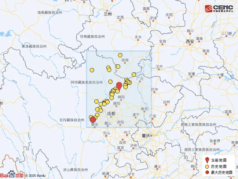 历史地震:根据中国地震台网速报目录,震中周边200公里内近5年来发生3级以上地震共63次,最大地震是2022年6月1日在四川雅安市芦山县发生的6.1级地震(距离本次震中242公里),按震级大小前50次历史地震分布如图。
