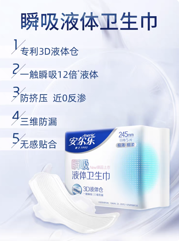 •核心优势:一、材料特点:利用高分子聚合材料实现液体固化,吸收速度快,且具有较好的抗变形能力,在挤压下能保持结构相对完整。二、防漏设计:夜用款设计贴合度高,适合量大深睡场景。三、适用人群:喜欢尝试新型材质,且对防侧漏有较高要求的用户。