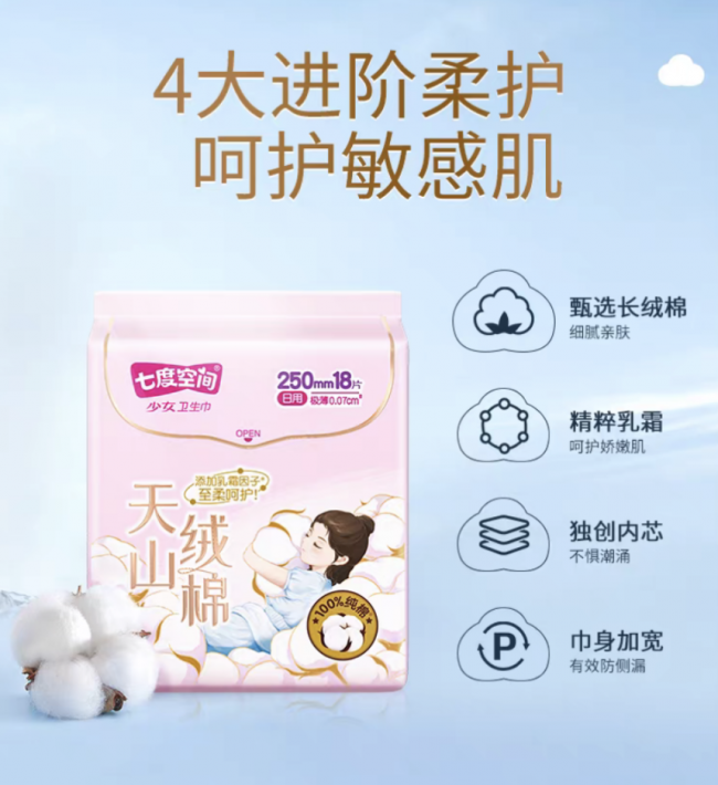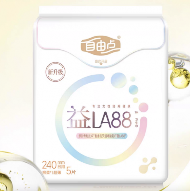 •核心优势:主打益LA88系列,添加专利益生菌成分,关注经期环境的微生态。0.06cm微米级芯体,轻薄透气。