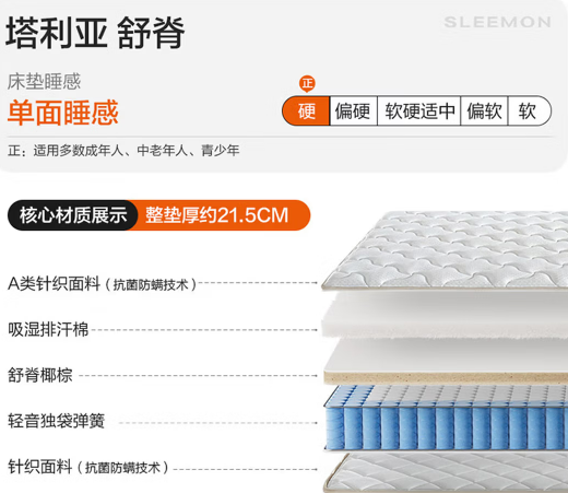 深入观察喜临门的产品,你会发现诸多精心设计的细节。像喜临门塔利亚舒脊床垫则专注于为追求坚实支撑力的消费者提供解决方案。这款产品采用偏硬抗菌椰棕设计,配合进口乳胶材质,既保证了床垫的硬度,又利用乳胶的柔韧性缓解压力。