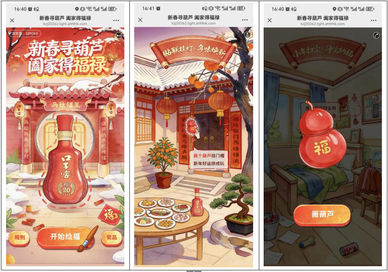 消费者扫描活动专属二维码,进入“新春寻葫芦”互动H5页面,通过手绘葫芦趣味闯关,即可参与随机抽奖,不仅有机会赢取兼8好酒,更有现金红包和口子窖限定周边好礼,让每一次互动都有惊喜相伴。