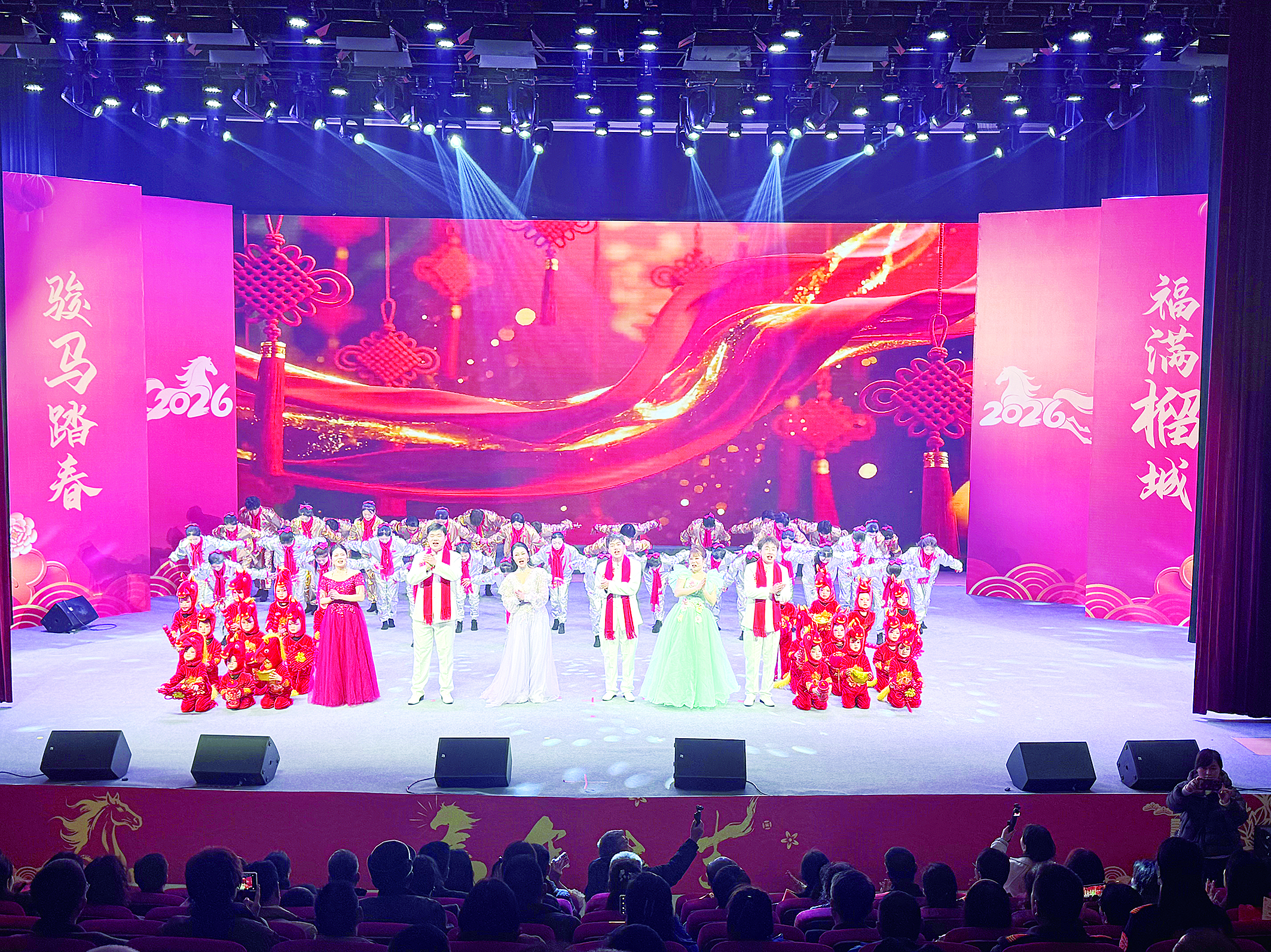 会场内暖意融融、掌声如潮。开场舞《骏马迎春》以奔腾之势点燃全场,演员们身姿矫健、舞步铿锵,将“干在实处、走在前列”的奋进姿态融入舞台。整场演出分为“金马呈祥”“策马奔腾”“跃马新程”三个篇章,歌舞、泗州戏、古彩戏法、灯歌联唱轮番登场。
