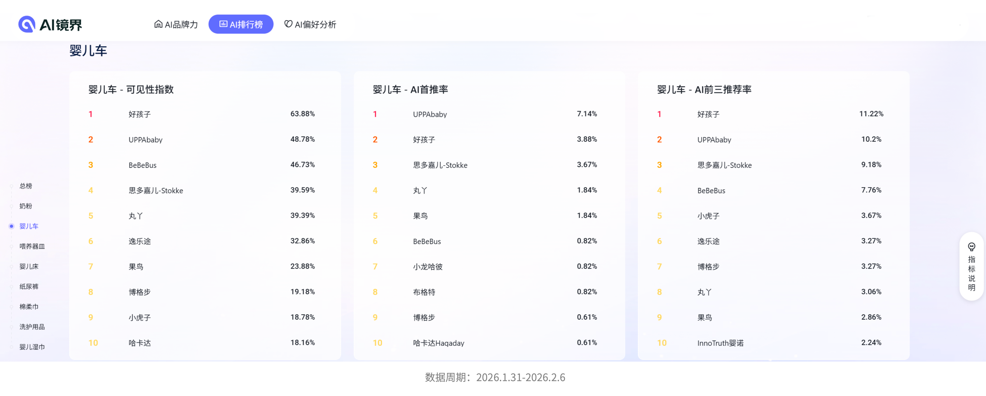 AI镜界的AI排行榜体系将分析细化到子品类与应用场景,并支持按AI可见性、首推率、前三推荐率等指标排序,所有结果均基于真实AI回答统计。