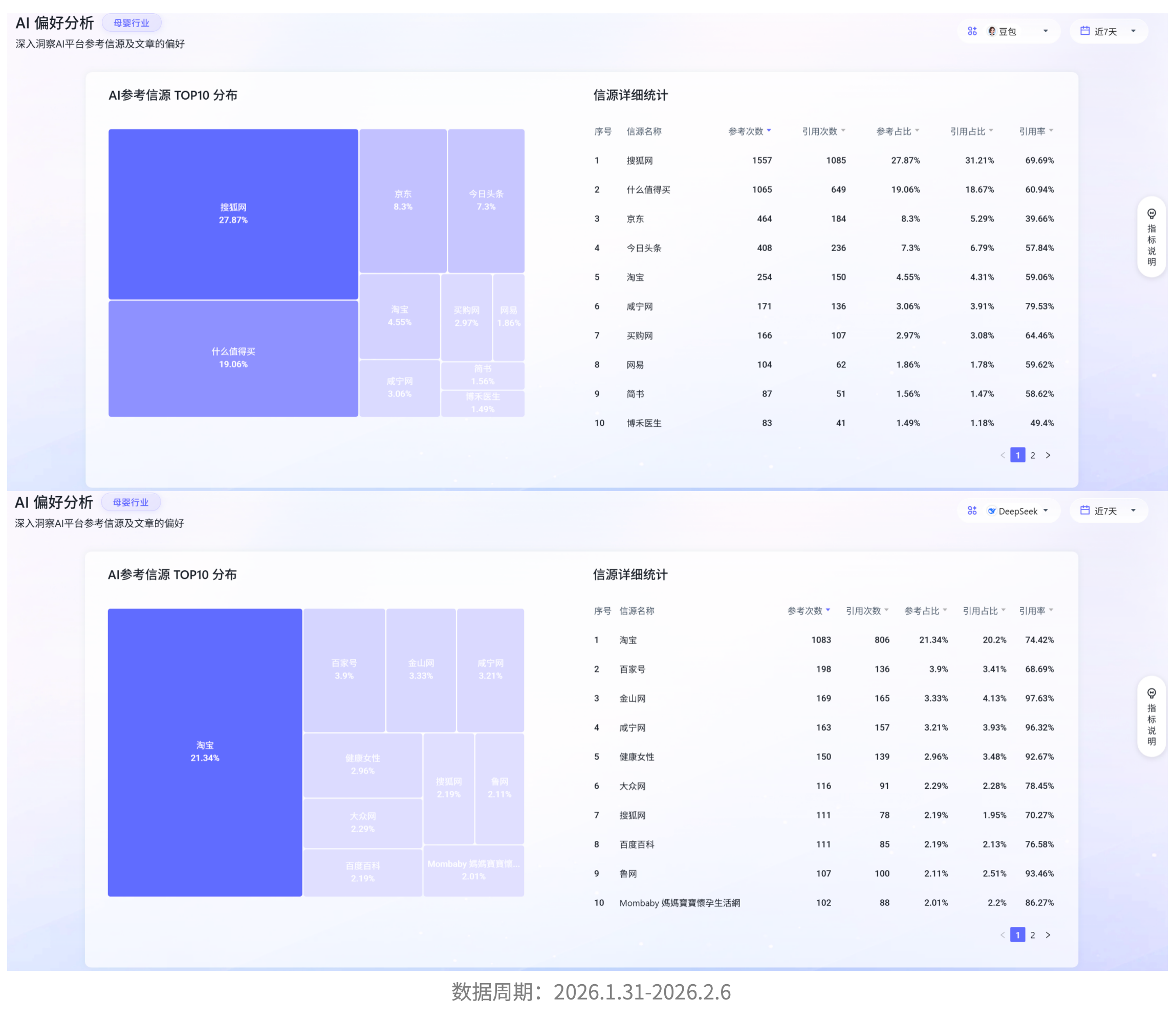 以母婴行业近7天AI平台参考信源数据为例,不同AI平台的引用路径差异明显。豆包偏向综合资讯与导购评测,搜狐网以27.87%参考占比、69.69%引用率居首,什么值得买占比19.06%,综合资讯、电商导购为核心信源。DeepSeek高度依赖电商平台,淘宝以21.34%参考占比、74.42%引用率成为第一大信源,金山网、咸宁网等地方门户虽参考占比不高,但引用率分别达97.63%、96.32%,内容采信效率突出。这也印证,品牌在传统渠道的声量优势,无法在各类AI场景中实现同等曝光,不同AI的信源偏好直接影响品牌内容的曝光与分发效果。
