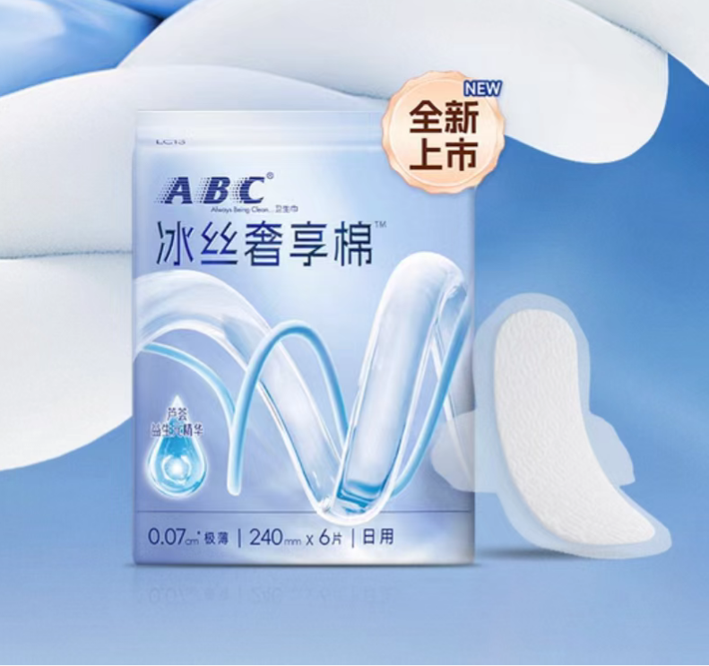 ABC的冰丝奢享棉系列以“舒感降温”为核心卖点,采用极薄0.07cm设计,轻盈贴身,带来清凉舒适的体验。产品规格为240mm/290mm,适合不同需求。超强吸力能在短时间内迅速吸收并锁住液体,减少表面残留,非常适合对舒适度和清爽感有较高要求的久坐用户。