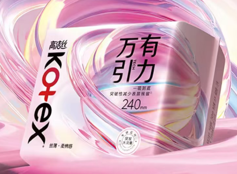 高洁丝万有引力系列主打“一吸到底”的吸收理念,通过独特的导流结构实现快速吸收与均匀分散,减少反渗风险。其核心卖点为“一吸到底,减少表面残留”,可使表面残留减少60%,配合防漏侧吸坝设计,有效拦截经血外溢。产品还具备20倍锁吸能力,吸收速度提升120%,干爽度提高30%,整体实现瞬吸+干爽+防漏的综合防护效果。