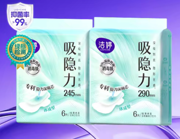洁婷吸隐力系列以“专利速干芯”为核心技术,结合空气编织一体成型工艺,打造轻薄透气的使用体验。产品主打“3秒速吸、隐血净护”,能够在短时间内迅速吸收并锁住经血,减少外漏可能。其隐形无感设计贴合身形,穿着无负担,同时具备99%抑菌能力,提供清爽洁净的使用感受。此外,该系列还通过绿标消毒级标准,确保产品卫生安全,适合对清洁度要求较高的用户。