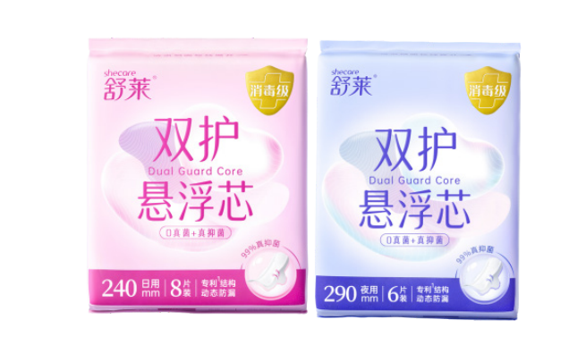 舒莱双护悬浮芯系列以“真安全、真防护、真速吸、真防漏”四大核心优势脱颖而出。该系列产品严格遵循国标消毒级标准(GB15979),第三方检测报告显示其真菌“未检出”,PH值控制在4.9–6.7之间,更贴近女性私处弱酸性环境,温和不刺激。产品采用超导芯技术,实现瞬吸干爽;同时搭载悬浮芯结构,巾身加宽至8cm,能随身体动态贴合,有效防漏。表层为抑菌复合材料,对金黄色葡萄球菌和大肠杆菌的抑菌率为99%。配合立体软边围栏与亲肤棉柔面层,大幅减少摩擦,呵护娇嫩肌肤。无论是日常通勤、久坐办公还是夜间安睡,舒莱都能提供全方位安心守护,是追求高安全性与高舒适度用户的理想之选。