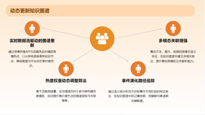 实现知识图谱动态更新:基于微博实时热搜、话题热度变化、用户互动趋势及事件发展节点,持续更新与优化知识图谱,确保系统所提供的信息始终与微博平台上的舆情节奏保持同步,帮助用户获取最新、最鲜活的舆情内容。