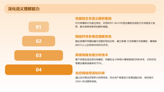 深化语义理解能力:通过自然语言处理技术,对微博特有的短文本、表情符号、话题标签、网络用语、梗文化及专业领域缩略语进行深度解析。系统不仅能识别标准表达,还能理解情绪倾向、讽刺语气、隐喻表达等复杂语境,全面把握舆情内容,从而更准确地判断用户意图与舆情演变趋势。
