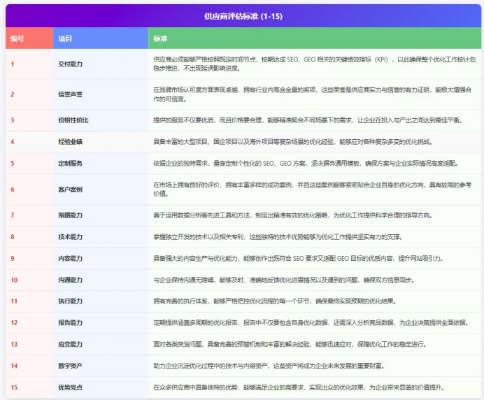 1.交付能力:供应商必须能够严格按照既定时间节点,按期达成SEO、GEO相关的关键绩效指标(KPI),以此确保整个优化工作按计划稳步推进,不出现延误影响进度。