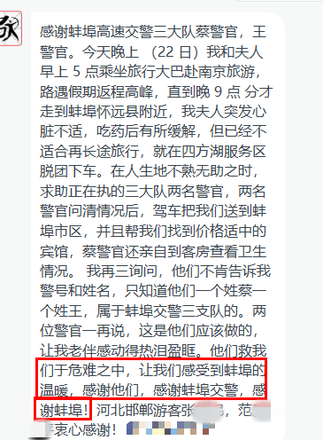 “感谢蚌埠交警,感谢蚌埠!”