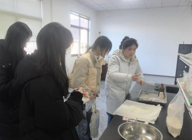随后成员们跟随技术人员来到了实验室来观摩产品检验流程,实验室负责人介绍说糯米生产和检验设备的自动化率高达70%-80%,大大减少了人工操作和提升出品率与产品品质稳定性,从而实现了产品细化,并且成员们了解到在国家的大力支持下自动化设备可享受国家25%的补贴;除此之外,为了更好地监督生产管理等,实验室还建立了生产数据库,每十分钟采集一次生产数据,实时监控调整,确保各种指标达标,不断提升生产率。看着一个个自动化设备井然有序地将糯米不断输送到各自对应的位置,成员们由衷感叹:技术,正是守护品质、赋能产业的关键力量。