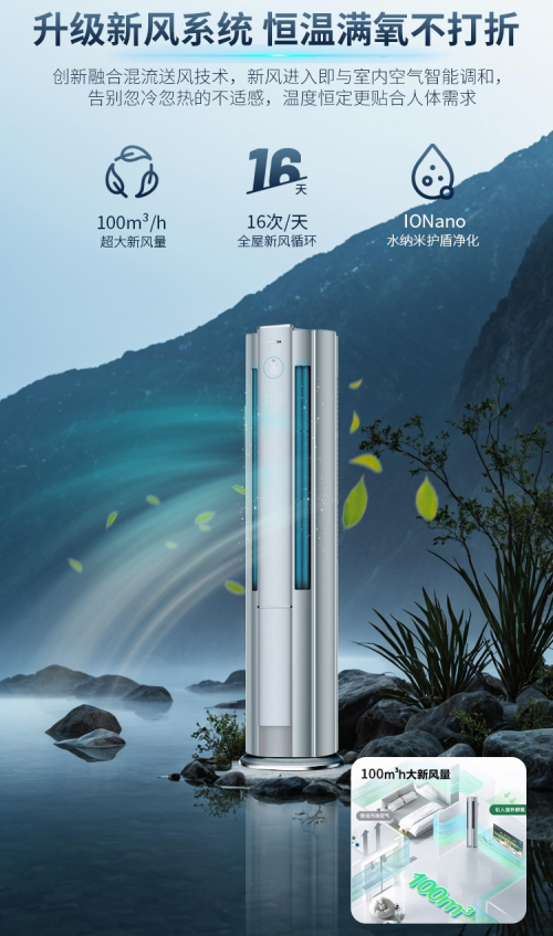 在空气净化方面,产品采用“四重过滤+水纳米防护+三重除菌”的立体净化架构。HEPA四重净化滤网配合100m³/h的新风换气量,可实现每天16次全屋新风循环,无需开窗即可持续送入洁净富氧空气,破解冬夏季节“室内憋闷”的通风难题。
