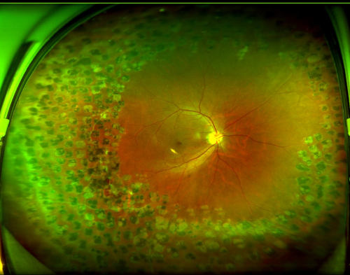 “因双眼在外院做过多次视网膜激光光凝术,视网膜周边形成了多量点状激光瘢痕。这些瘢痕与正常视网膜粘连紧密,大大增加了手术的复杂性和风险。对主刀医生的技术要求高——需要更丰富的经验、更精湛的显微手术技术,以及应对复杂组织变化的能力。”