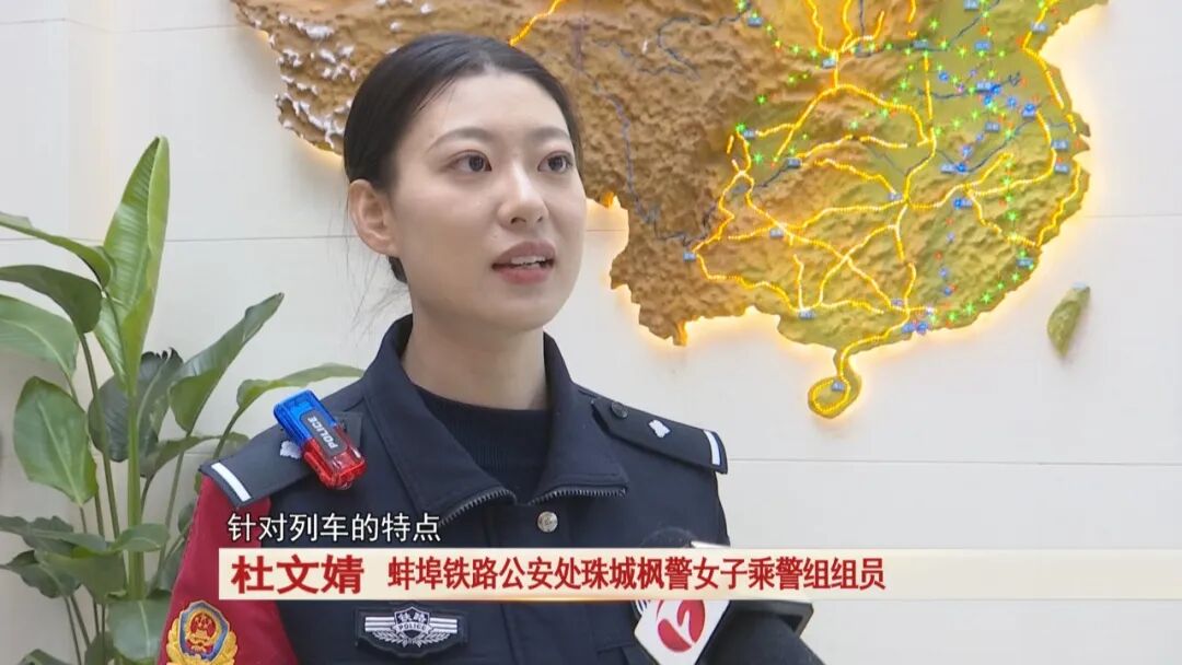 女子乘警组队员朱淑晨和杜文婧介绍,这趟列车上旅游的乘客比较多,特别是儿童旅客。乘警是乘客在旅途中最先想到的人,所以她们代表着安全和正义,而女子乘警组又加入了一份温柔的视角和力量。针对列车的特点,她们每天都在不间断巡车,一趟来回,就要将近一个小时,每天得在列车内走上几万步。巡逻过程中,她们要提醒乘客遵守乘车规范,同时也要开展反诈知识宣传。