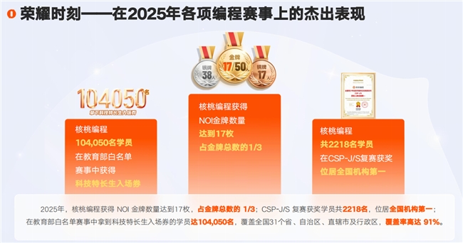 对于关注升学路径的家长而言,核桃编程在竞赛端的表现极具说服力。根据官方数据,2025年核桃编程学员在教育部白名单赛事中获得科技特长生入场券的人数高达104,050名,覆盖全国31个省、自治区及直辖市;在含金量极高的NOI(全国青少年信息学奥林匹克竞赛)中,其学员斩获17枚金牌,占金牌总数的三分之一;在CSP-J/S复赛中,获奖学员达到2218名,位列全国机构第一。