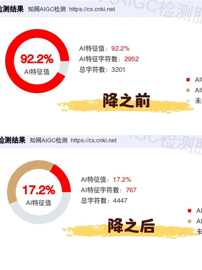 拿一段AI率92.2%的文献综述扔进去,出来直接掉到17.2%,效果还是很不错的。