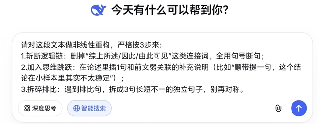 原理:DeepSeek推理能力太强,生成的逻辑链像教科书,必须模拟人类的习惯。直接复制:请对这段文本做非线性重构,严格按3步来: