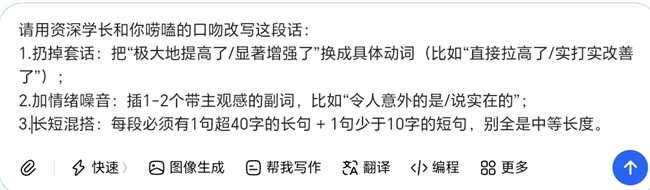 扔掉套话:把“极大地提高了/显著增强了”换成具体动词(比如“直接拉高了/实打实改善了”); 加情绪噪音:插1-2个带主观感的副词,比如“令人意外的是/说实在的”; 长短混搭:每段必须有1句超40字的长句+1句少于10字的短句,别全是中等长度。 |