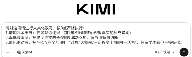 原理:Kimi擅长长文本理解,输出过于通顺、严谨、无瑕疵,反而像AI。需要故意增加不完美的人类细节,降低顺滑度。直接复制:请对这段话进行人类化改写,按3点严格执行: