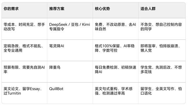 为了帮大家彻底破局,我不仅摸透了AI检测的底层逻辑,还针对DeepSeek、豆包、Kimi定制了反套路降AI指令,同时自费实测十几款工具,筛出3款真正适配学生党的高效降ai工具。这篇不玩虚的,零成本手动改、花钱提效率两种方案,全给你讲明白!