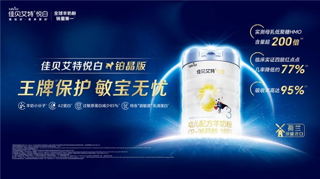悦白铂晶版:更加低敏的“增重防护盾”羊奶粉针对对低敏性要求更高的家庭,悦白铂晶版特含“疏敏源”乳清蛋白,并搭配超200倍HMO,经过临床喂养实证,宝宝四肢湿疹症状表现情况从6%降到了1.4%,四肢红点点几率降低约77%(北京大学公共卫生学院《不同配方奶粉临床喂养研究报告》)。羊奶小分子+天然A2蛋白更易吸收,营养吸收率同样高达95%。