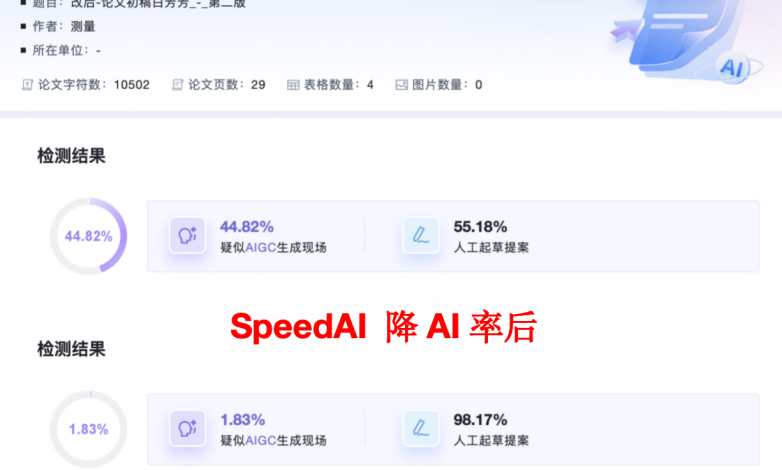 SpeedAI科研小助手最恐怖的是它的**“一次过”能力**。测试了一篇用DeepSeek写的管理学论文(知网AI率98.2%),处理完检测,AI率掉到3.1%。这不是个例——用户实测数据显示,它能一次性降低95%的AI率,而且不是靠“口语化”糊弄,完美契合“把AIGC率压到15%以下”的硬核需求。
