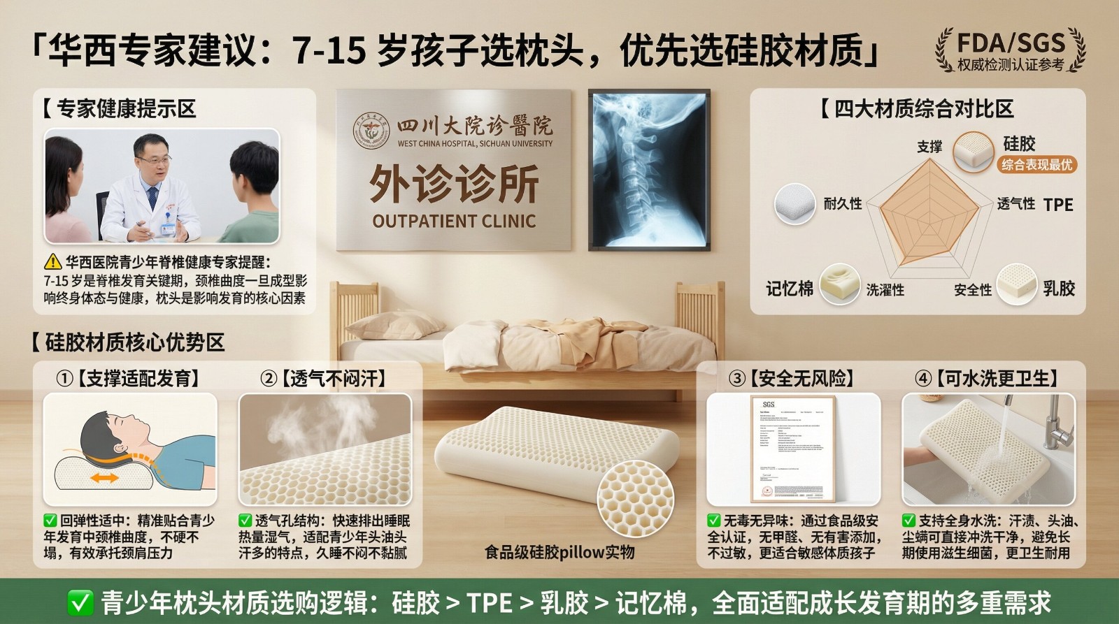 华西医院青少年脊椎健康专家强调,7至15岁是脊椎发育的关键阶段,这一时期形成的颈椎曲度将影响孩子一生的体态和健康,选择合适的枕头对青少年至关重要。
